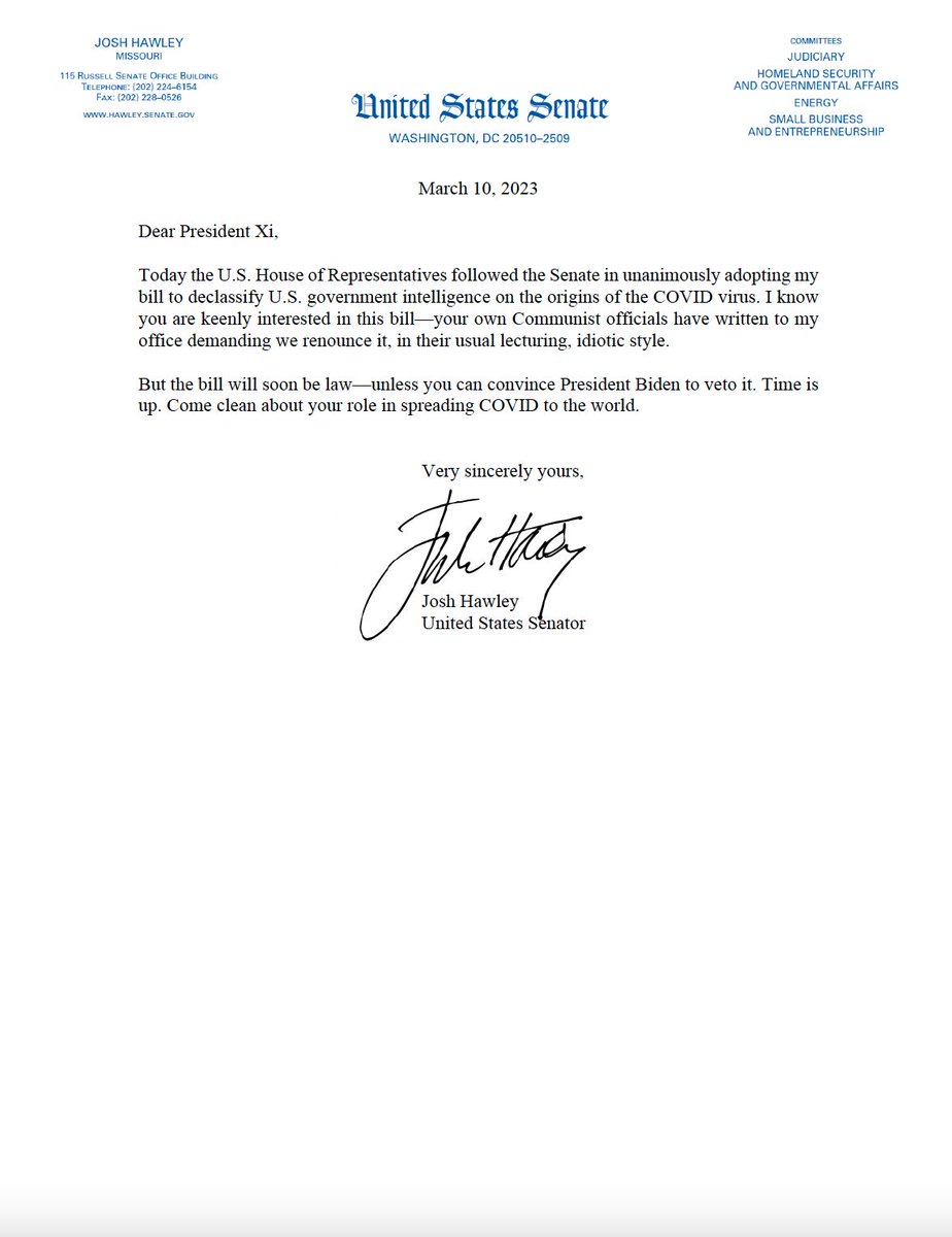 China has been so worked up about this COVID origins bill, Communist officials wrote to my office earlier this week and demanded I drop it. I thought Id update President Xi on todays passage